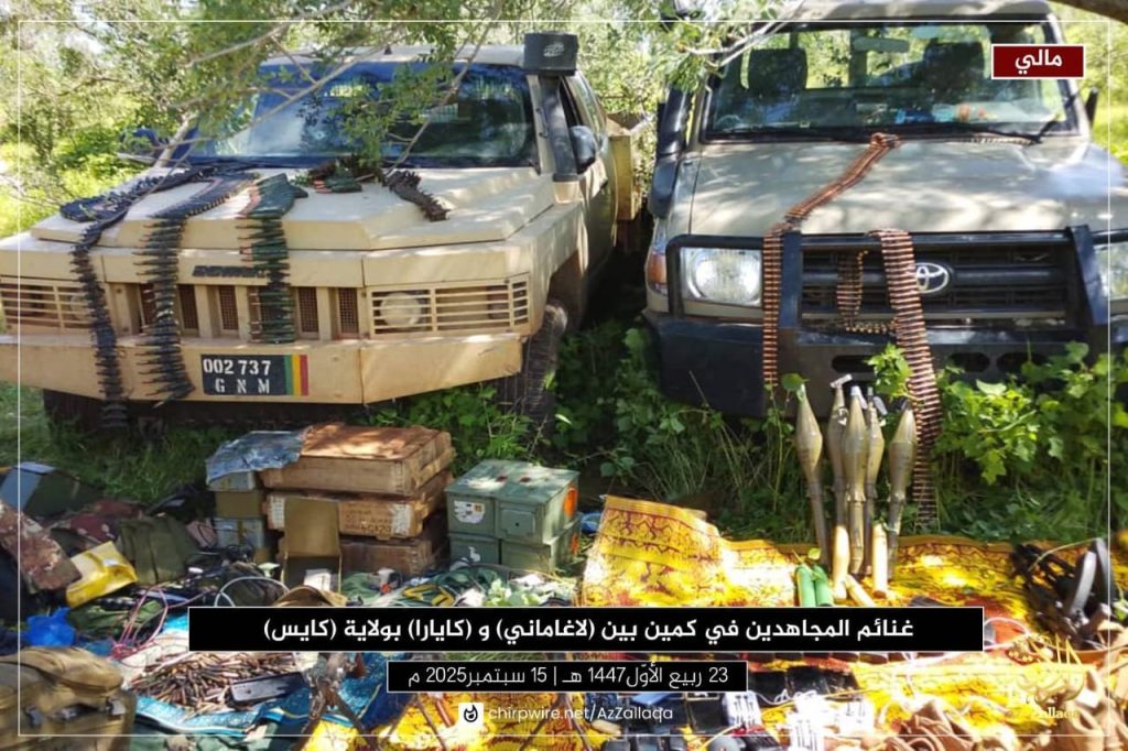 وأضاف بيان الجماعة أنها نفذت كميناً مسلحاً بين لاغاماني وكايارا في ولاية كاي، أسفر – بحسبها – عن مقتل وإصابة عدد من عناصر الجيش المالي، وتدمير عشرات الآليات، واغتنام آليتين عسكريتين وأسلحة متنوعة، من بينها: مدفع بيكا، 3 بنادق كلاشينكوف، 2 قاذف RPG، 5 قذائف RPG، سلاح دوشكا، و6 صناديق ذخيرة.