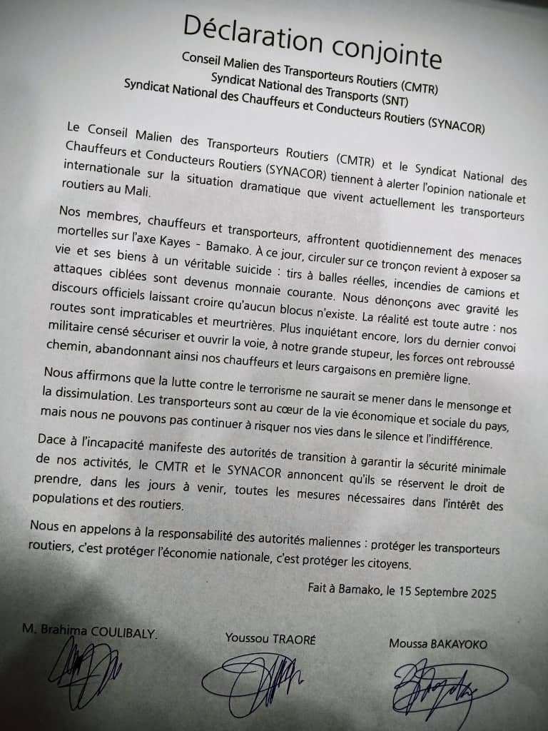 في هذا السياق، أصدرت ثلاثة من أكبر النقابات الوطنية للنقل البري في مالي – مجلس الناقلين الماليين (CMTR)، النقابة الوطنية للنقل (SNT)، والنقابة الوطنية للسائقين والناقلين (SYNACOR) – بياناً مشتركاً اتهمت فيه سلطات المرحلة الانتقالية بممارسة “التضليل الإعلامي” وإنكار الواقع الأمني المرير.